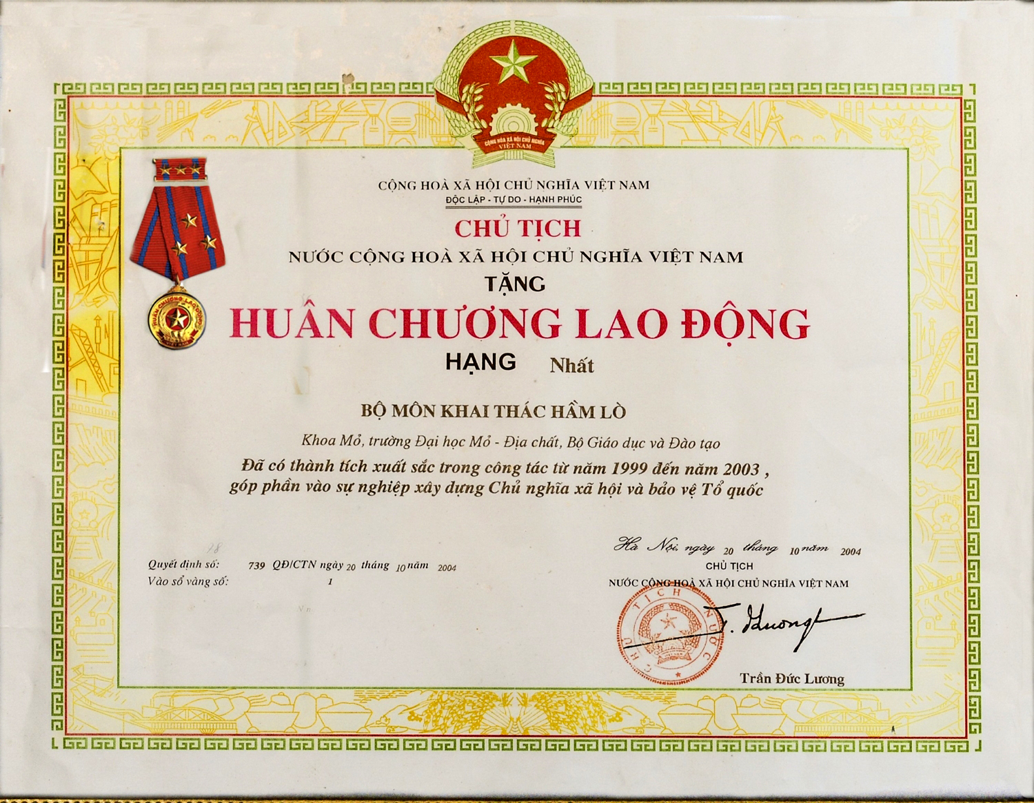 Bộ môn Khai thác Hầm lò nhận Huân chương lao động hạng nhì ngày 29/6/1998
