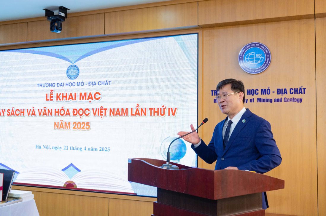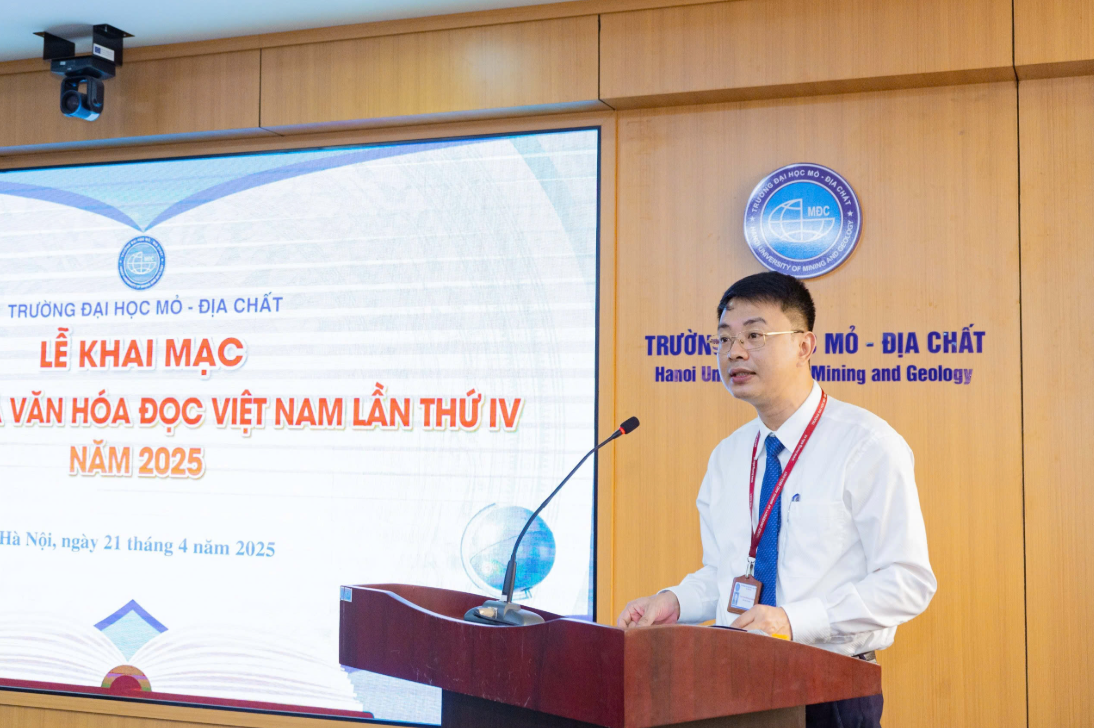 Phát biểu tại chương trình, PGS.TS Nguyễn Ngọc Khánh – Phó Hiệu trưởng Nhà trường – nhấn mạnh: sách là người thầy thầm lặng, là nguồn cảm hứng, là kho tàng tri thức quý báu, nuôi dưỡng tâm hồn, bồi đắp khát vọng vươn lên. Thầy Phó Hiệu trưởng cho rằng, trong thời đại chuyển đổi số, văn hóa đọc không chỉ dừng lại ở hành vi đọc, mà còn là một thái độ học tập suốt đời, là cách con người tiếp cận tri thức một cách sâu sắc, có chọn lọc và chiều sâu. Thầy kêu gọi các đơn vị trong trường tổ chức các hoạt động thiết thực nhằm vun đắp môi trường học thuật giàu tri thức, khai phóng tư duy và sáng tạo. Với vai trò là trung tâm đào tạo và chuyển giao tri thức, Trường Đại học Mỏ - Địa chất cam kết đầu tư phát triển hệ thống học liệu đa dạng, không gian học thuật hiện đại và lan tỏa tinh thần học thuật đến mọi thành viên trong cộng đồng HUMG.