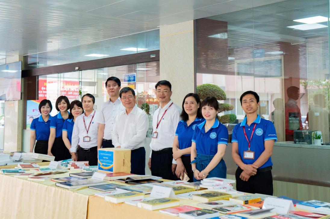 Lãnh đạo Nhà trường cùng các cán bộ viên chức Trung tâm Thông tin - Thư viện chụp hình lưu niệm tại Không gian sách